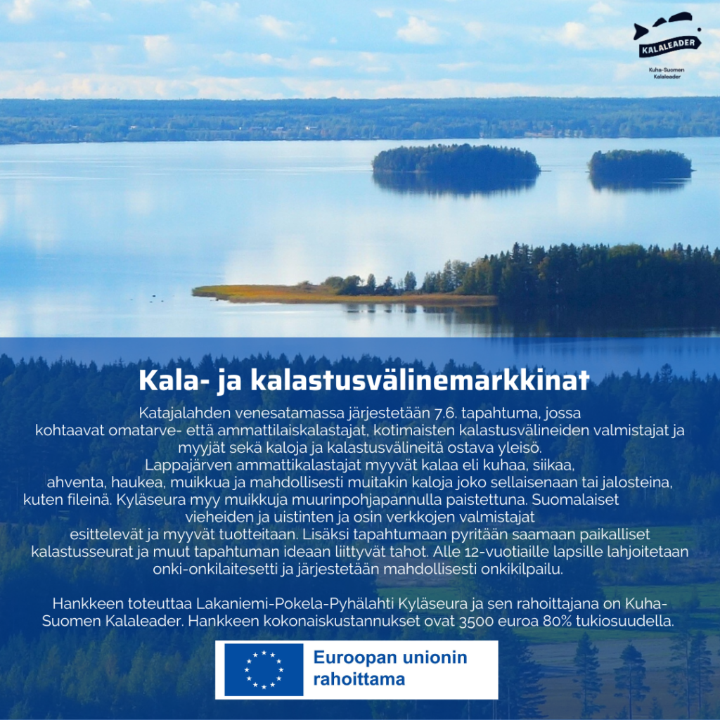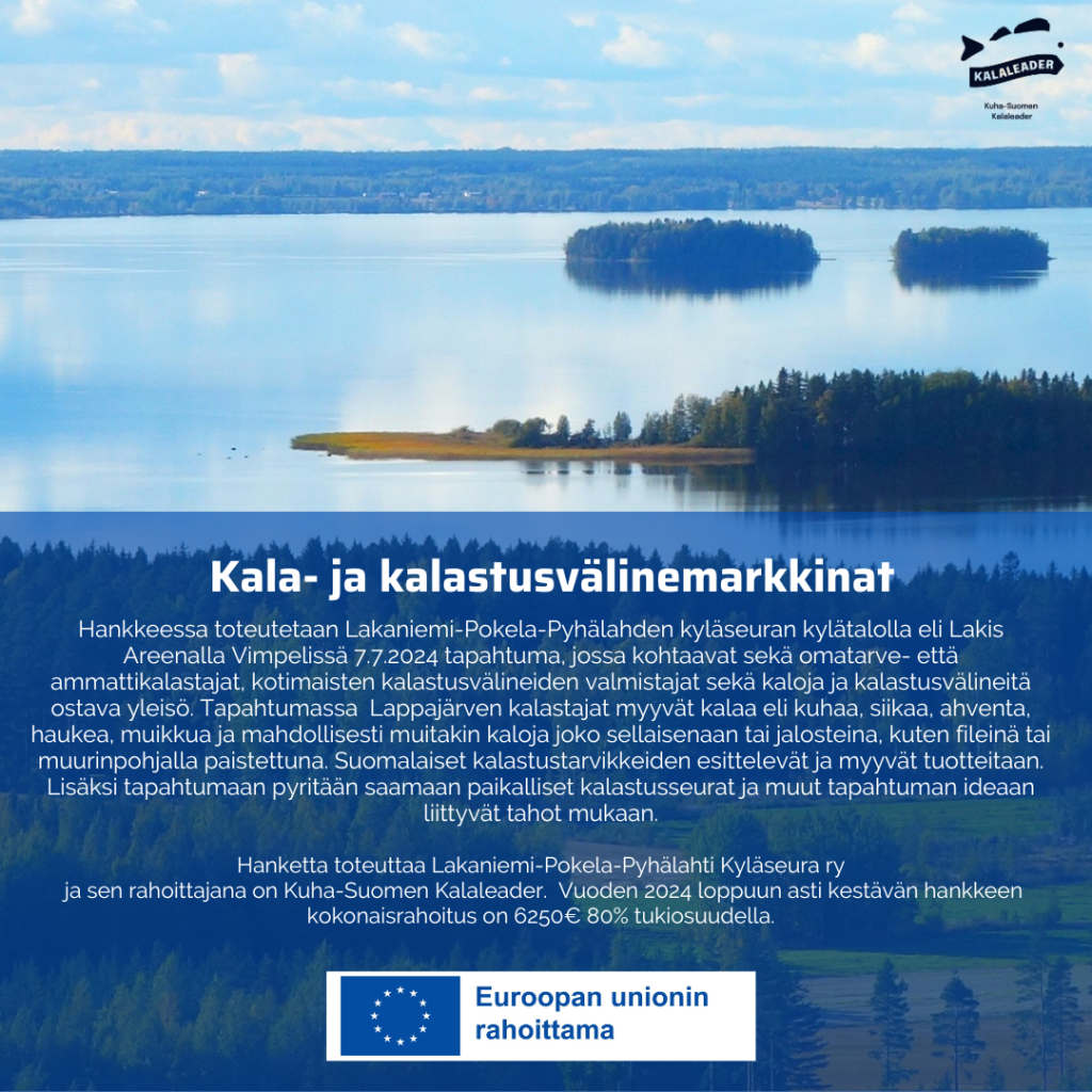 Hankkeessa toteutetaan kyläseuran kylätalolla eli Lakis Areenalla Vimpelissä 8.6.2024 tapahtuma, jossa kohtaavat sekä omatarve- että ammattilaiskalastajat, kotimaisten kalastusvälineiden valmistajat ja myyjät sekä kaloja ja kalastusvälineitä ostava yleisö. Tapahtumassa lähinnä Lappajärven kalastajat myyvät kalaa eli kuhaa, siikaa, ahventa, haukea, muikkua ja mahdollisesti muitakin kaloja joko sellaisenaan tai jalosteina, kuten fileinä. Suomalaiset kalastustarvikkeiden eli lähinnä vieheiden ja uistinten ja osin verkkojen valmistajat esittelevät ja myyvät tuotteitaan. Lisäksi tapahtumaan pyritään saamaan paikalliset kalastusseurat eli Vimpelin, Kurejoen ja Lappajärven Kalastusseurat, Järviseudun Kalastajat ry.:n ja muut tapahtuman ideaan liittyvät tahot kuten esimerkiksi maa- ja kotitalousnaiset. Tapahtumaan pyritään saamaan kalastusta harrastava julkisuuden henkilö juontajaksi ja hankerahoituksella katettaisiin juontajan palkkio ja matkakulut. Muut järjestelyt toteutetaan talkootyönä. Mikäli tapahtuma kiinnostaa yleisöä, ammattikalastajia ja kalastusvälineiden tekijöitä ja osoittautuu suosituksi, tehdään siitä jokavuotinen perinne.