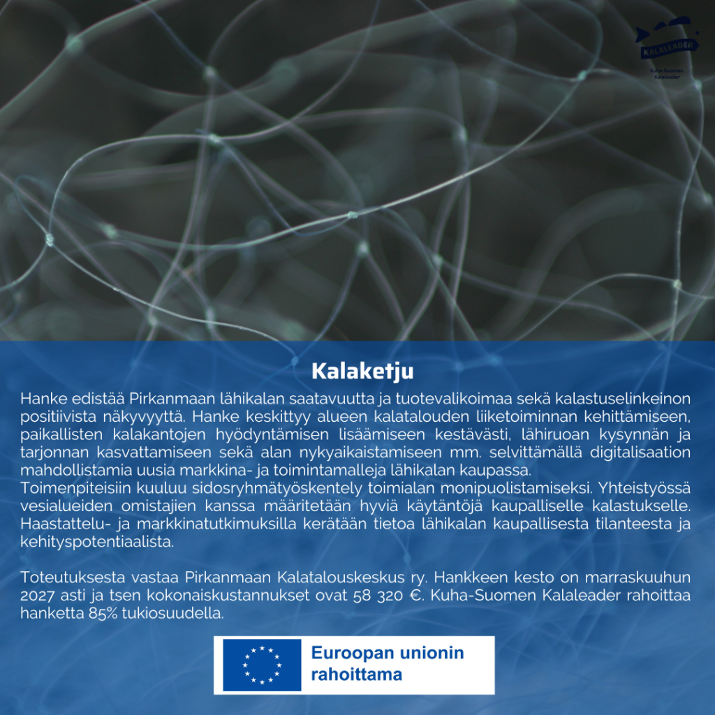 Hankkeen toteuttaa Pirkanmaan kalatalouskeskus ja marraskuun 2027 loppuun asti kestävän hankkeen kokonaisrahoitus on 58 320€ 85% tukiosuudella. Hanke on päättynyt.