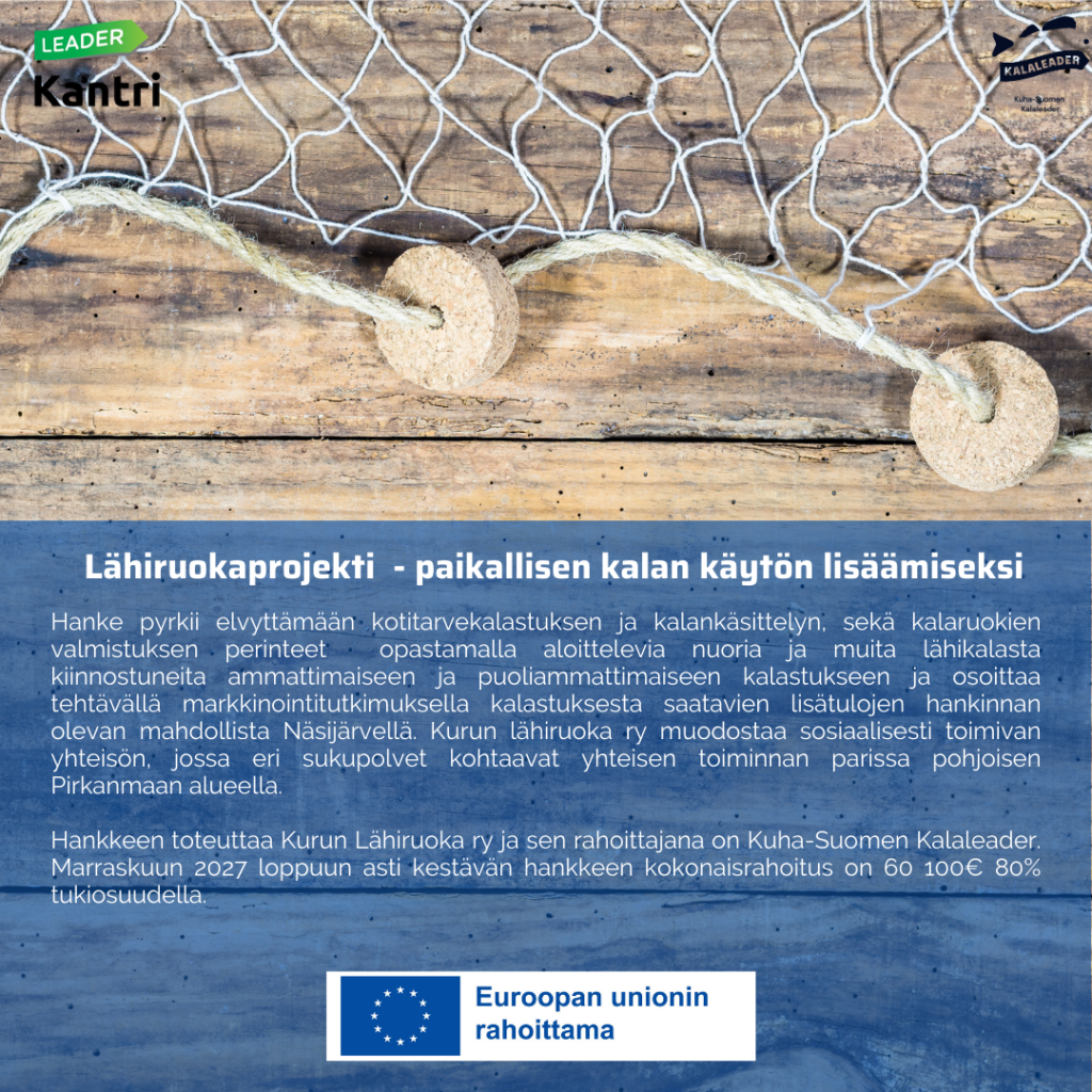 Hankkeen toteuttaa Kurun Lähiruoka ry. Marraskuun 2027 loppuun asti kestävän hankkeen kokonaisrahoitus on 60 100 €. Kuha-Suomen Kalaleader tukee hanketta 80% tukiosuudella eli 48 000 eurolla.